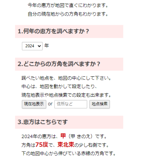 ①「何年の恵方を調べますか?」で、今年の西暦を選択します。