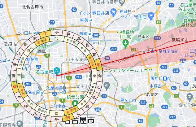 赤く色が付いている部分が、調べた年の恵方ということになります。