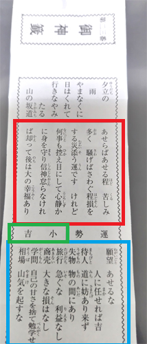 最初に見るのは、和歌の下の部分です(赤い枠)。おみくじによっては、和歌のみのところもありますね。